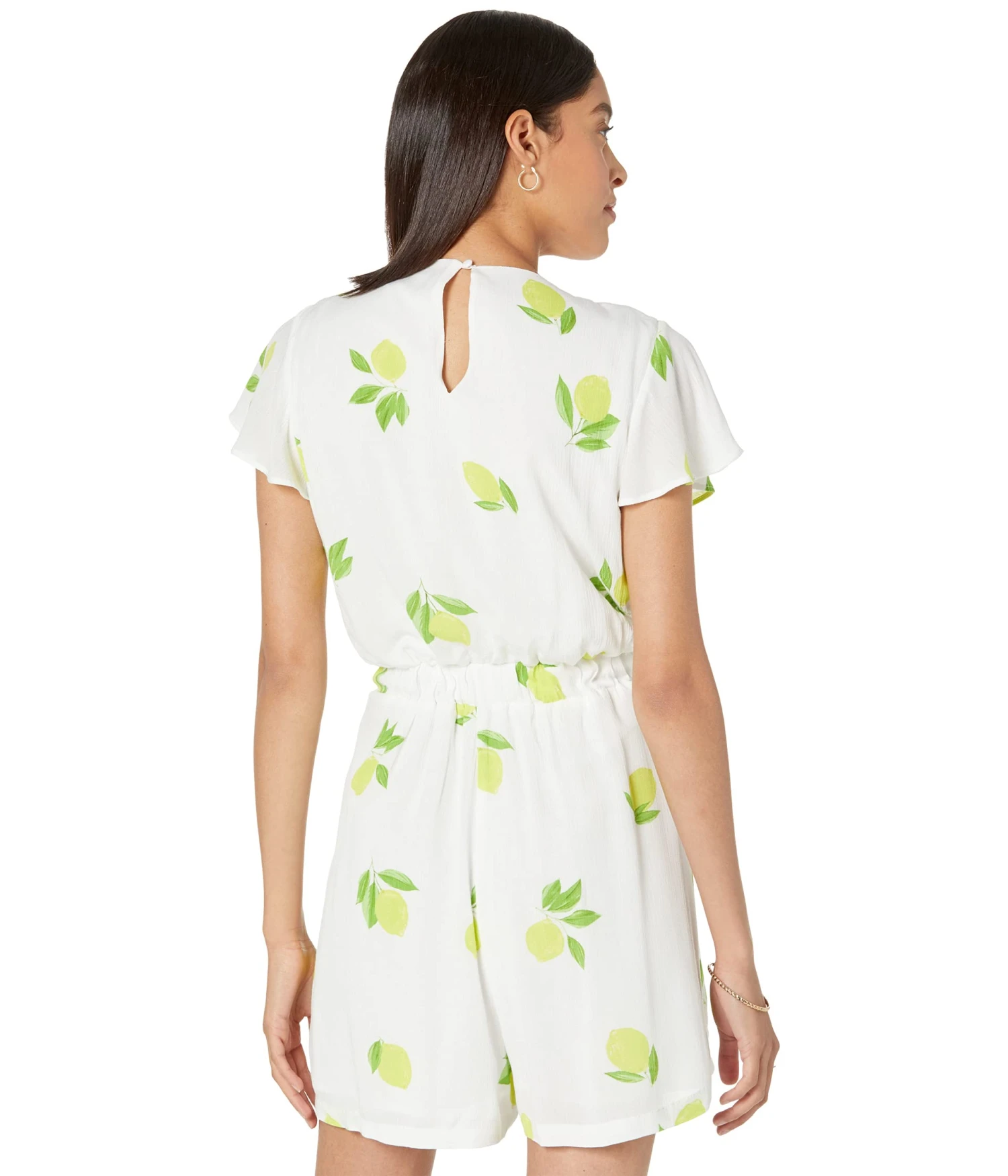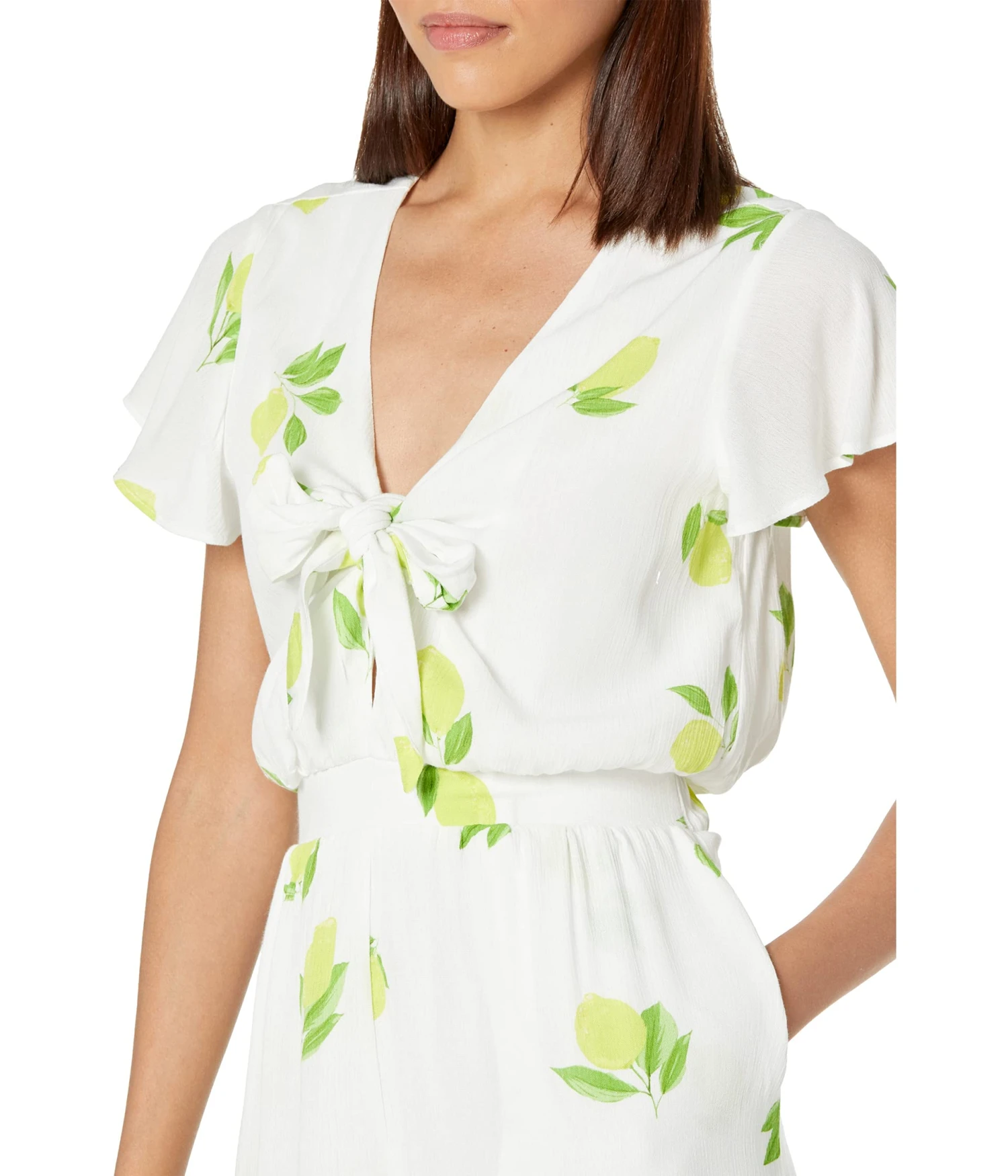 - The 1.STATE™ Tie Front Romper is a short-sleeve romper patterned in bright lemons and finished with ties.