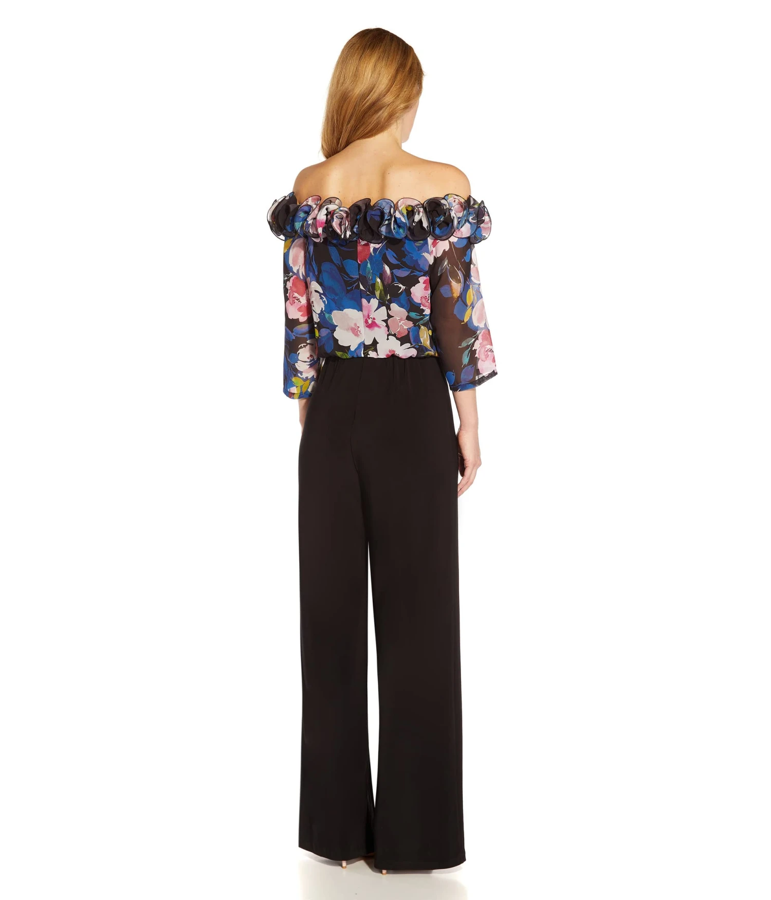 - Make a bold statement in the comfy Adrianna Papell® Floral Chiffon and Jersey Off-the-Shoulder Jumpsuit.