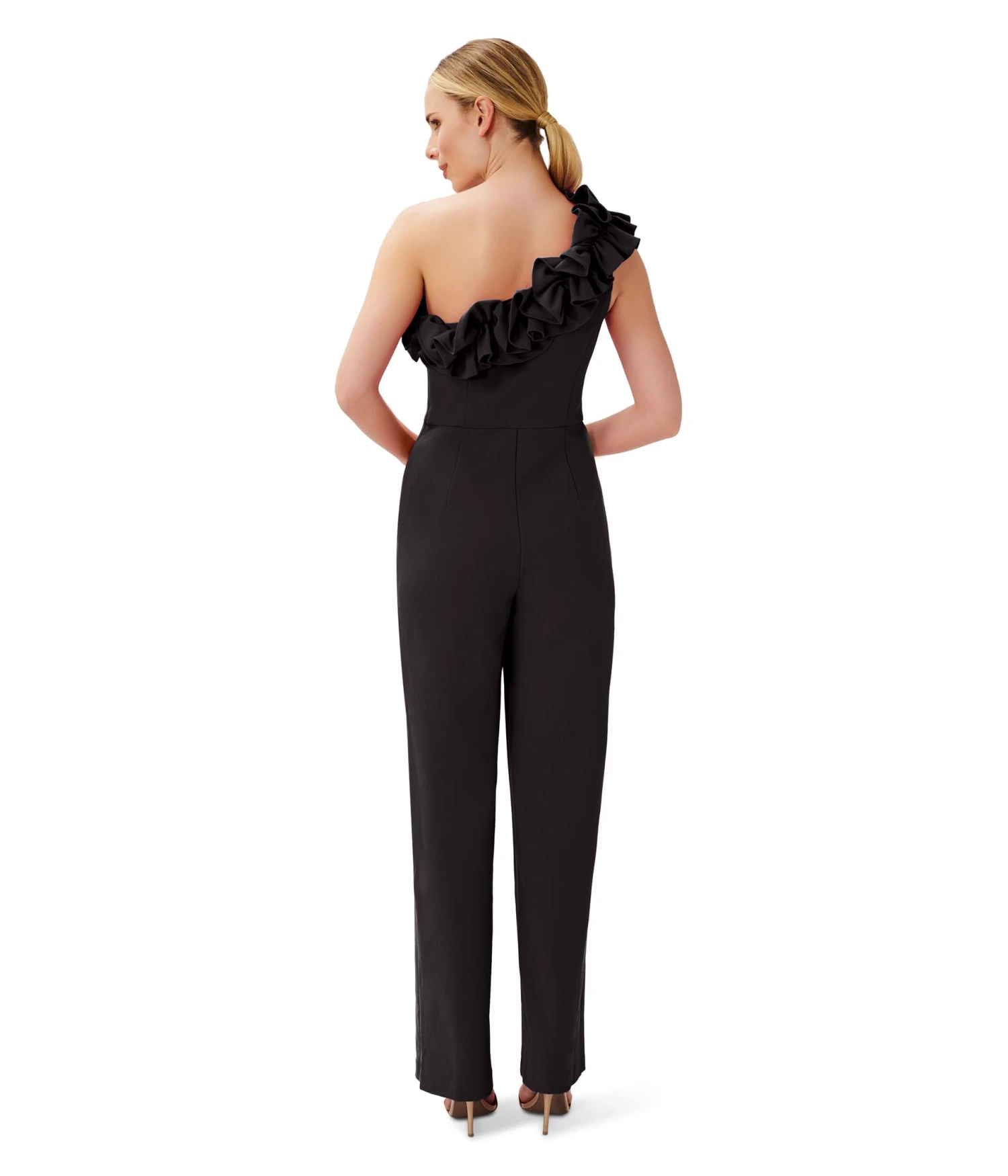 - Embrace a sleek and elegant look for your romantic date night wearing the Adrianna Papell® Stretch Crepe Ruffle One Shoulder Jumpsuit.
