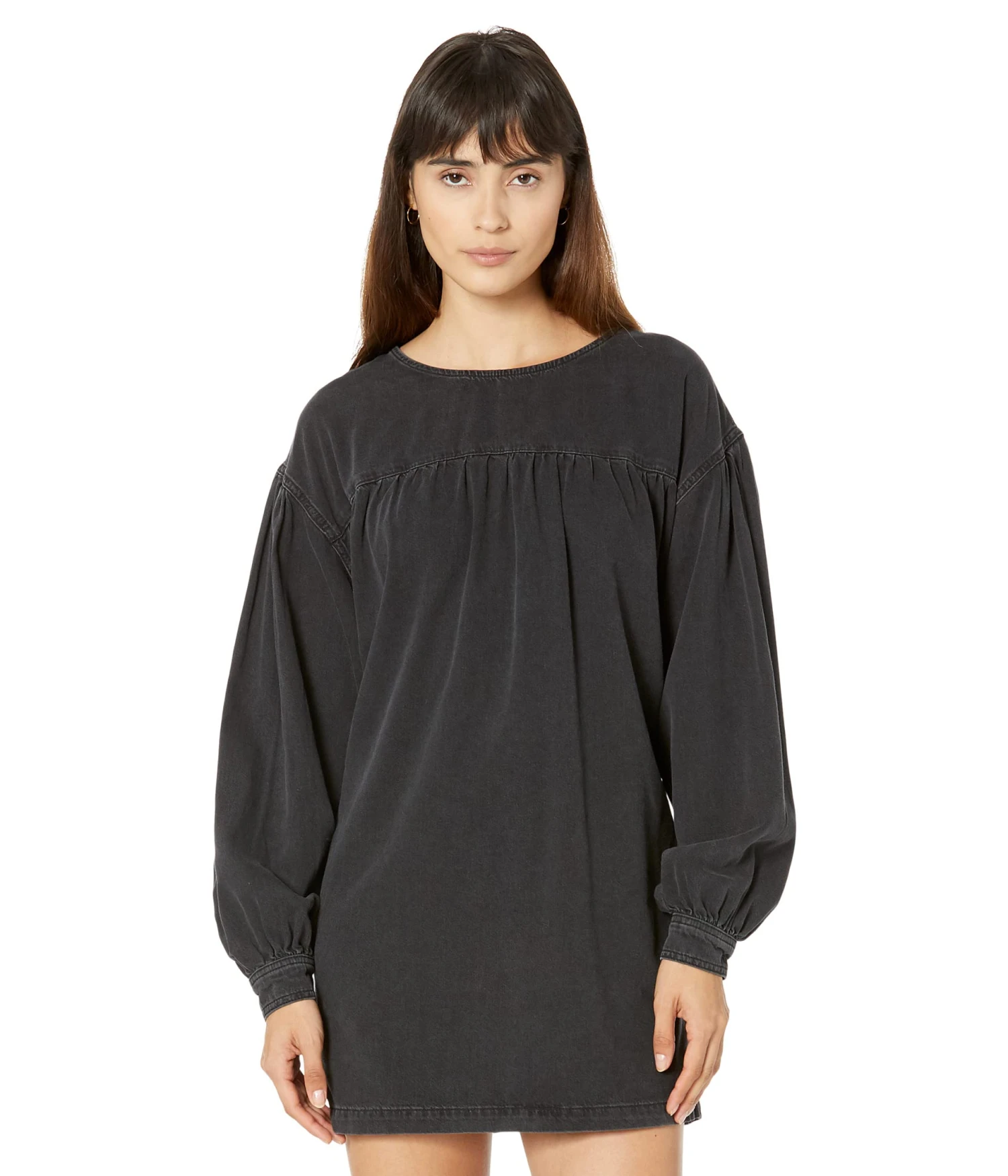 - Crew neckline and long blouson sleeves.