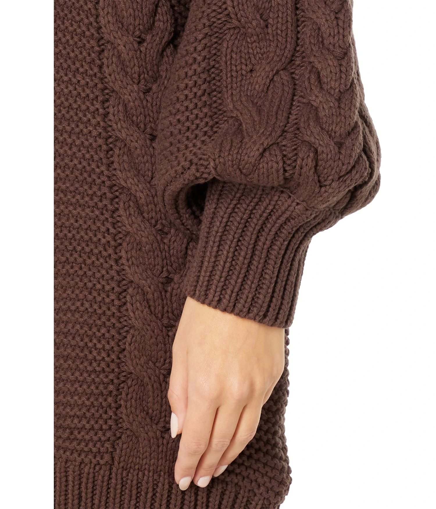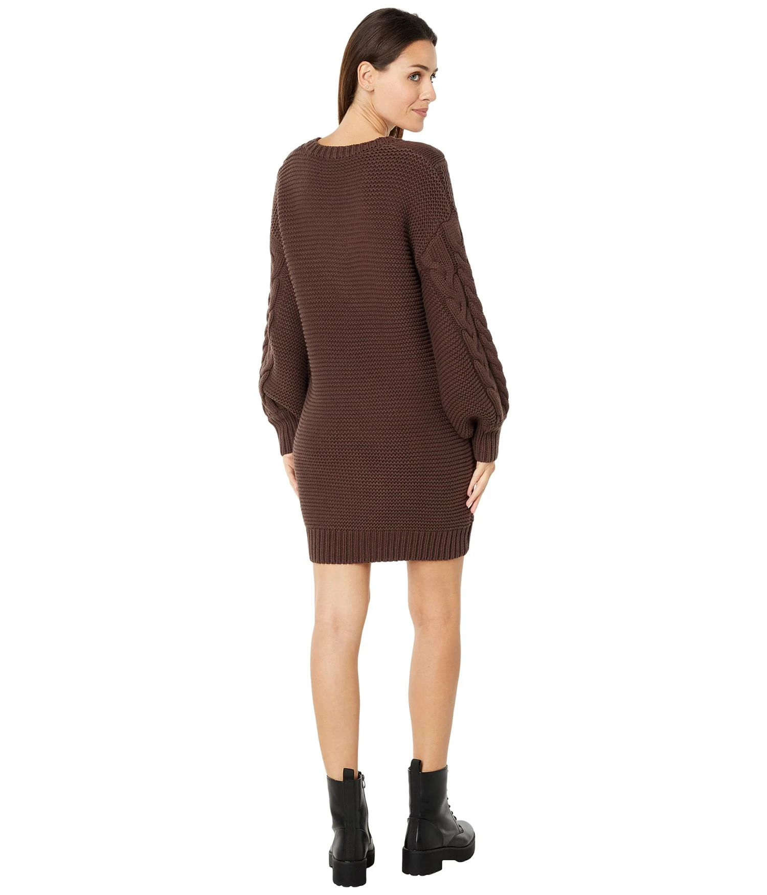 - Loose fit sweater dress features a V-neckline and long, puffed sleeves with ribbed knit cuffs.