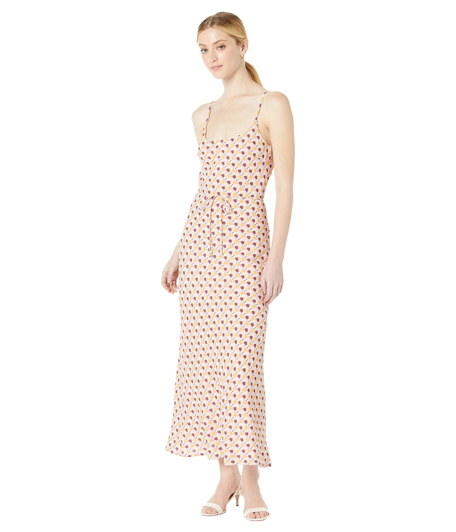 - Midi-length dress fashioned with scoop neckline on the front and the back and adjustable spaghetti straps.