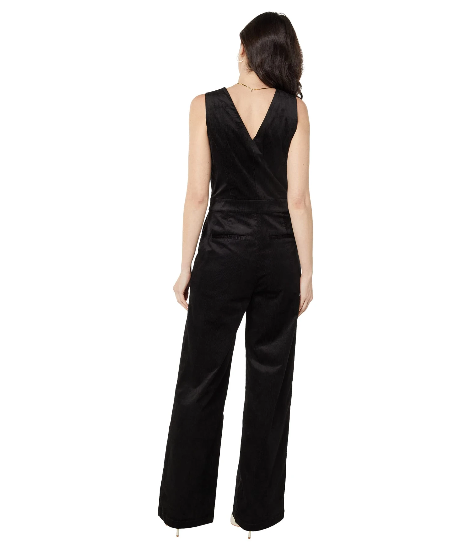 - Deep V-neckline and sleeveless construction.