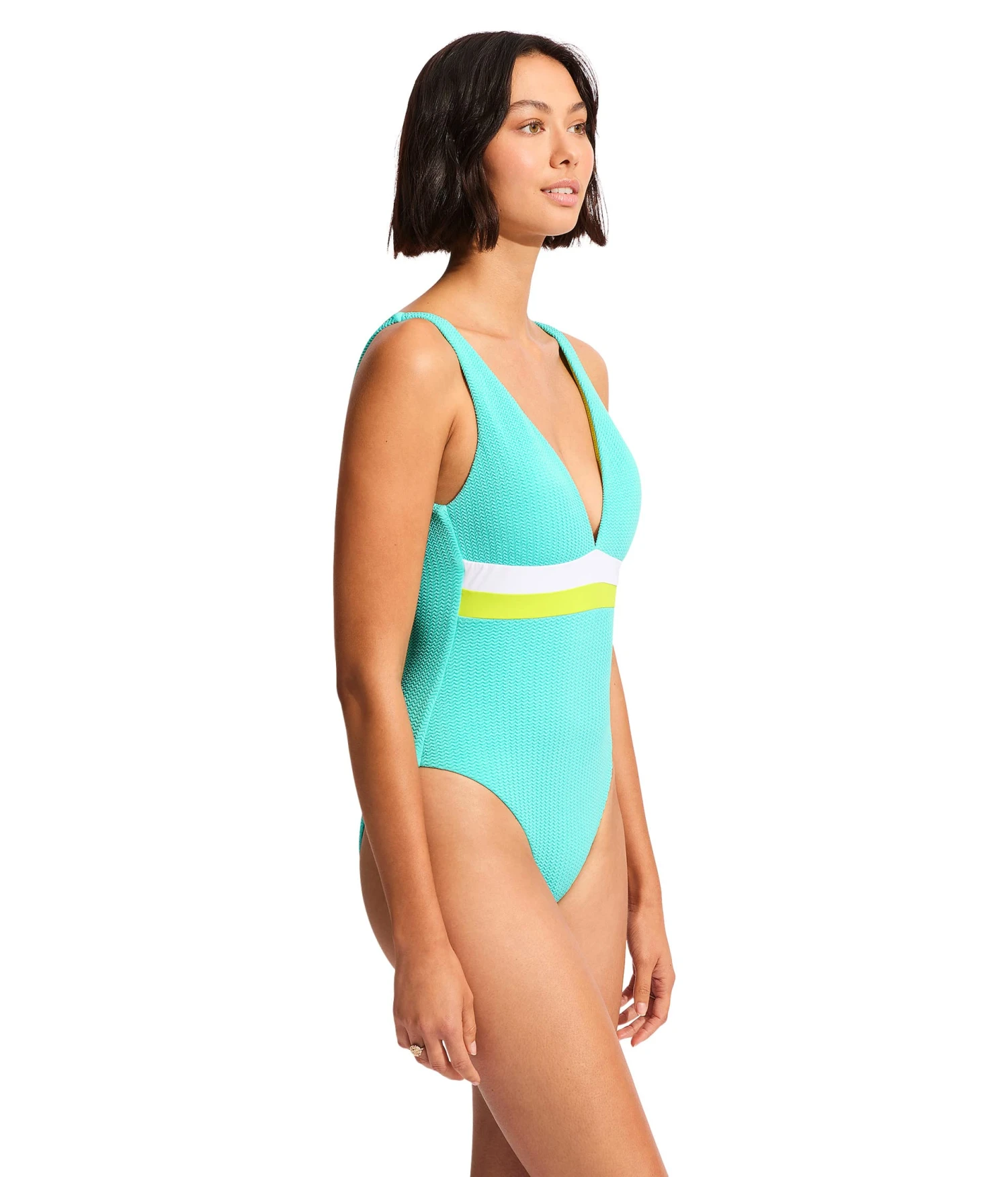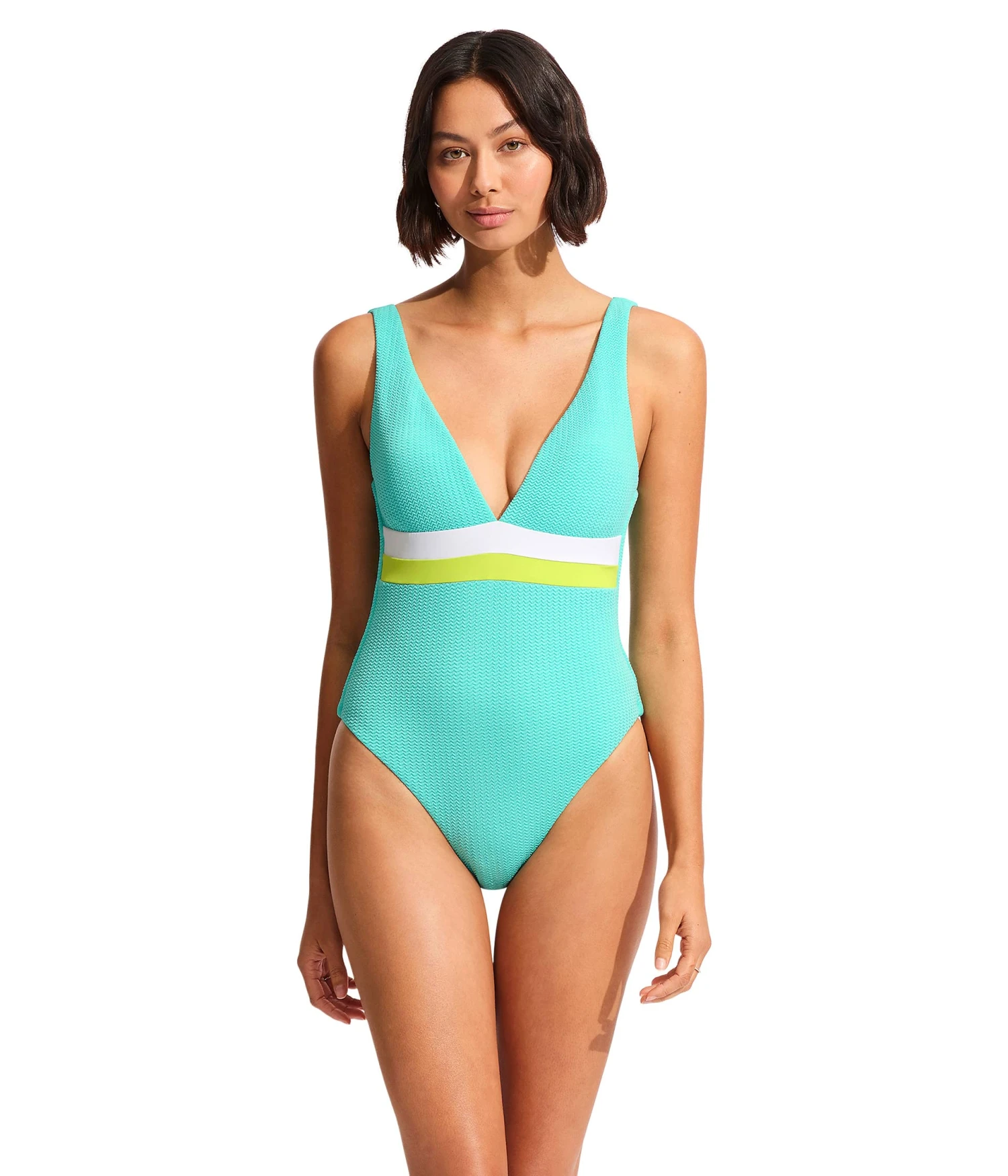 - Look nothing less than a diva wearing Seafolly® Slice Of Splice Spliced Deep V-Neck One-Piece.